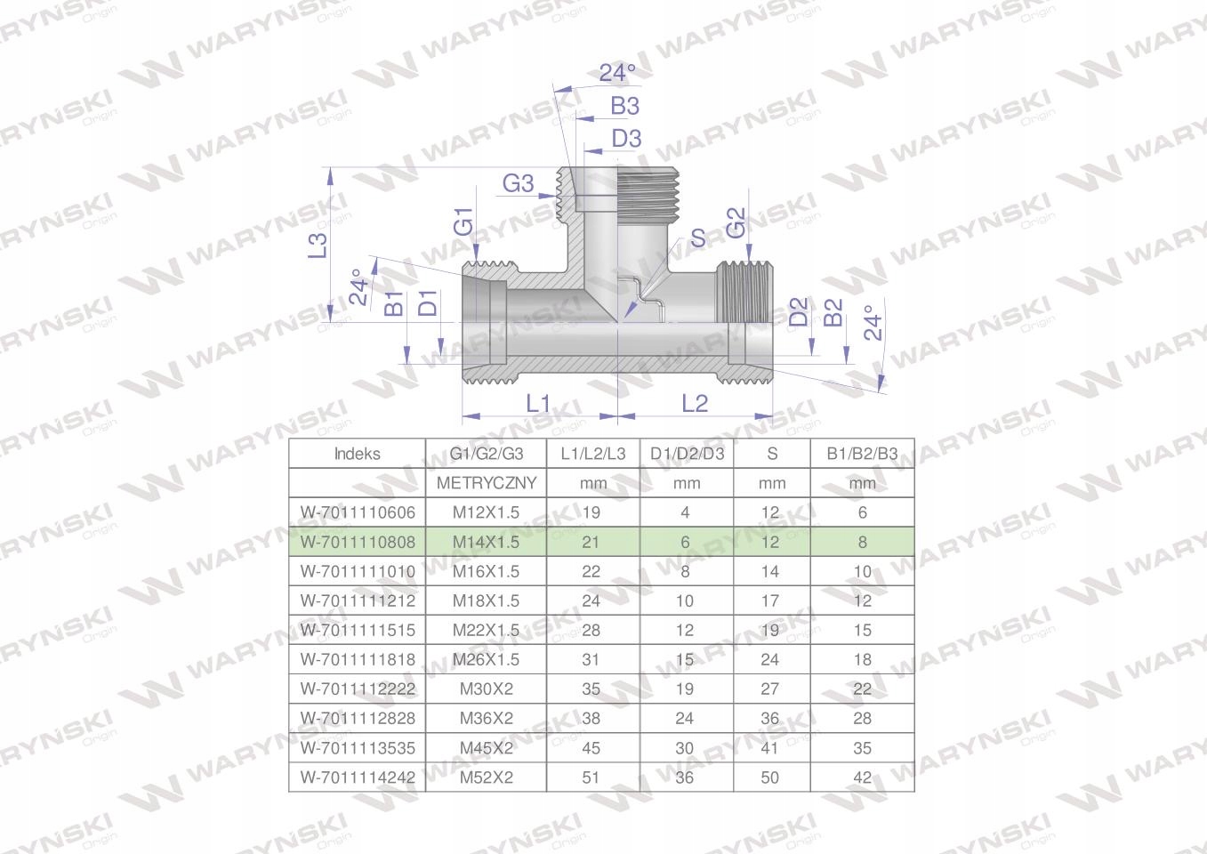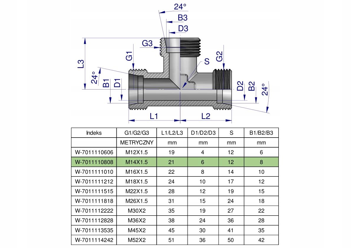 Trójnik hydrauliczny metryczny BBB M14x1.5 08L (XT) Waryński. Elementy złączne zostały zaprojektowane i wykonane zgodnie z obowiązującymi normami, które szczegółowo opisują wymagania jakościowe i wymiarowe. Są kompatybilne z elementami złącznymi innych renomowach producentów hydrauliki siłowej.