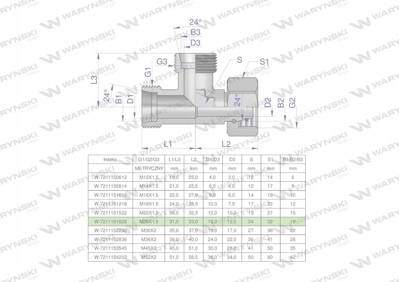 Trójnik hydrauliczny niesymetryczny metryczny BBA M26x1.5 18L (XEVL) Waryński. Elementy złączne zostały zaprojektowane i wykonane zgodnie z obowiązującymi normami, które szczegółowo opisują wymagania jakościowe i wymiarowe. Są kompatybilne z elementami złącznymi innych renomowach producentów hydrauliki siłowej.
