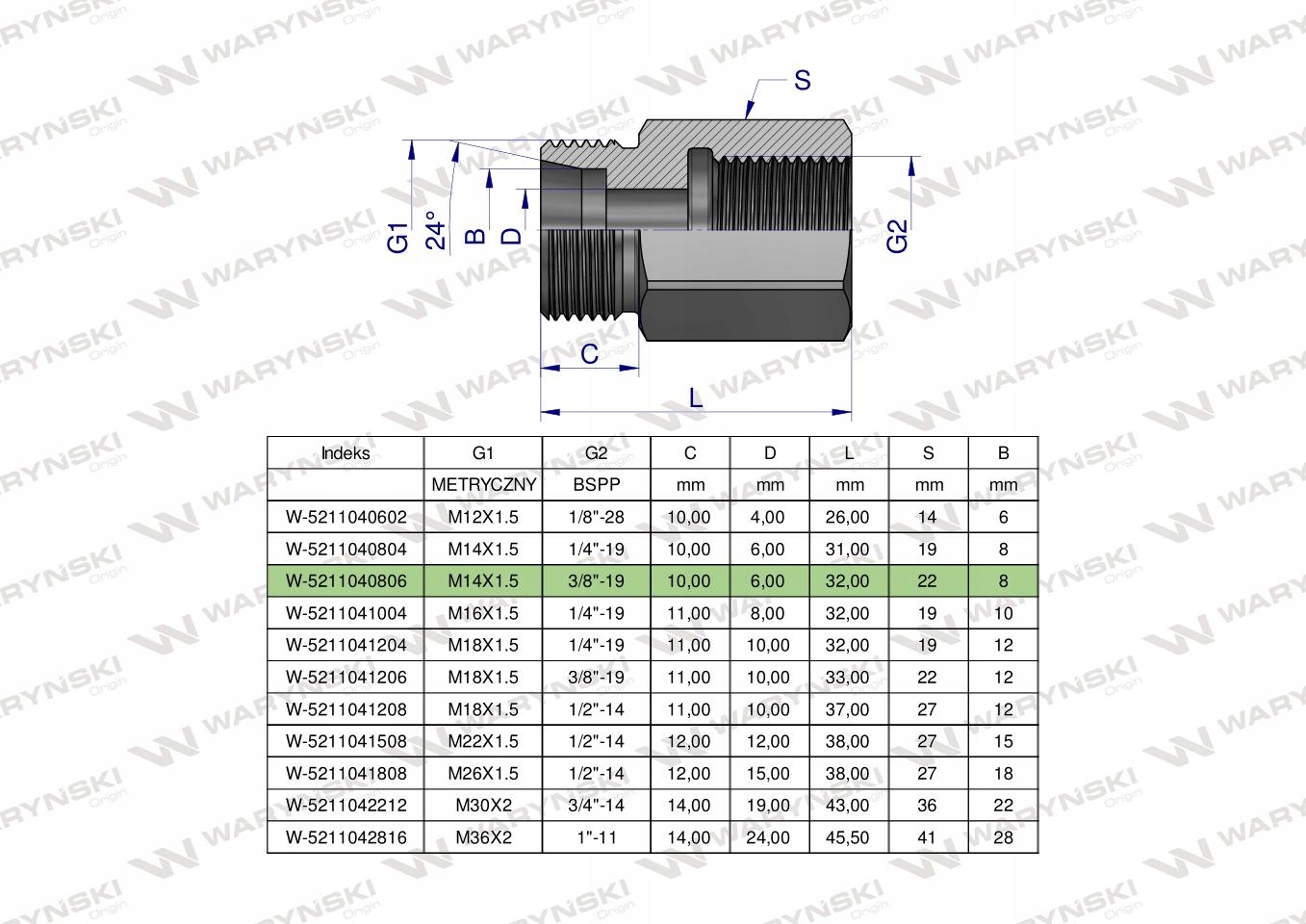 Tulejka różnicowa hydrauliczna AB M14x1.5 08L GZ x 3/8" BSP GW Waryński. Elementy złączne zostały zaprojektowane i wykonane zgodnie z obowiązującymi normami, które szczegółowo opisują wymagania jakościowe i wymiarowe. Są kompatybilne z elementami złącznymi innych renomowach producentów hydrauliki siłowej.