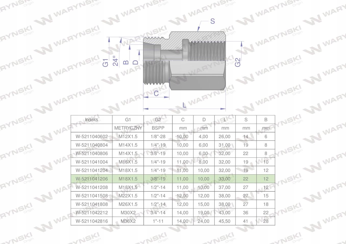 Tulejka różnicowa hydrauliczna AB M18x1.5 12L GZ x 3/8" BSP Waryński. Elementy złączne zostały zaprojektowane i wykonane zgodnie z obowiązującymi normami, które szczegółowo opisują wymagania jakościowe i wymiarowe. Są kompatybilne z elementami złącznymi innych renomowach producentów hydrauliki siłowej.