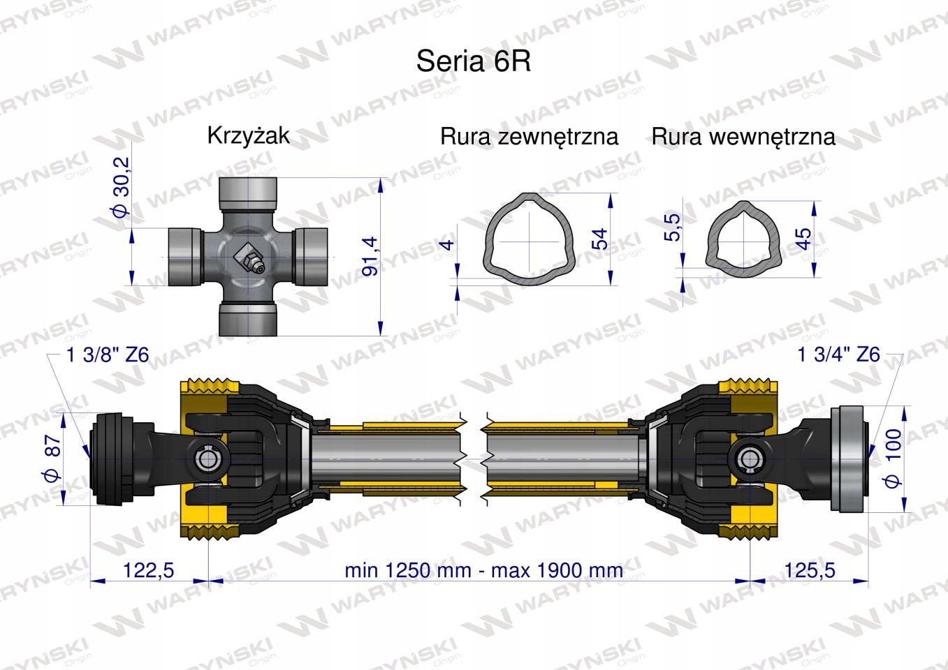 Wał przegubowo-teleskopowy 1250-1900mm 830Nm Z6 - 1 3/4 CE 2020 seria 6R Waryński