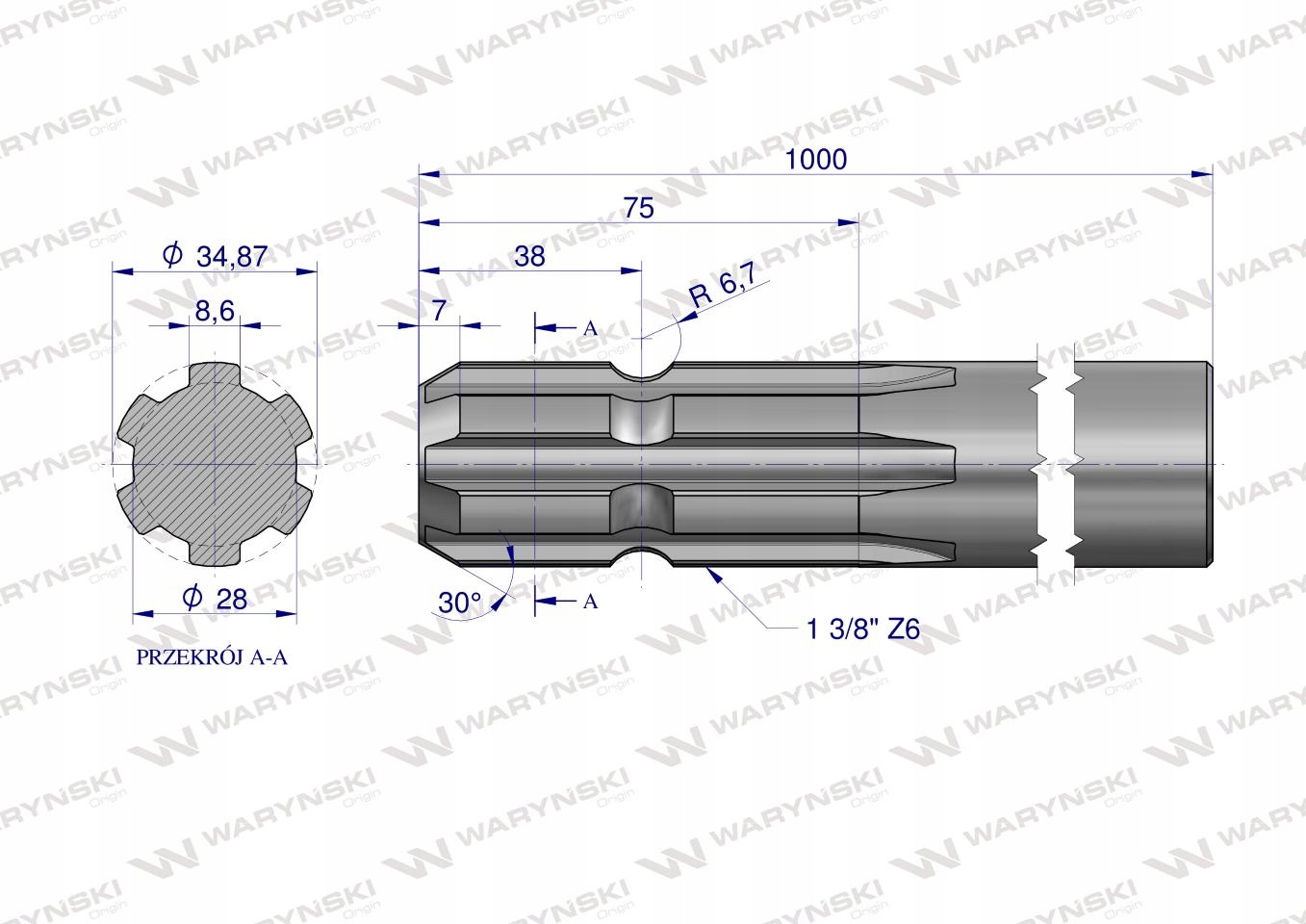 Wałek WOM frezowany jednostronnie 1000mm Z6 - 1 3/8 WARYŃSKI, W-3211000