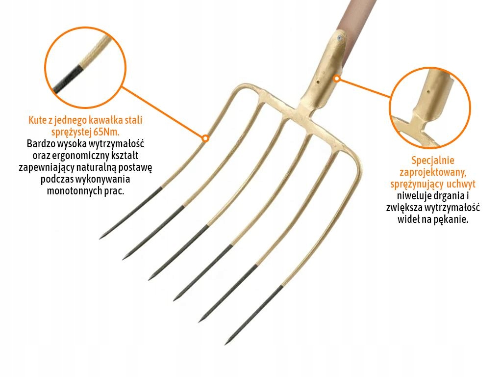 Widły gospodarcze 6-zębne do kiszonki / kukurydzy, na drewnianym trzonku (dł. 1580 mm), kute / TEGER bardzo trwałe i wytrzymałe, zęby kute, wykonane z wysokiej jakości stali hartowanej, węglowej 65Mn, o podwyższonej wytrzymałości na pękanie. Trzonek wykonany z wysokiej jakości drewna bukowego odpornego na złamania. Widły swoją szerokością roboczą idealnie nadają się do przerzucania kiszonki / kukurydzy.