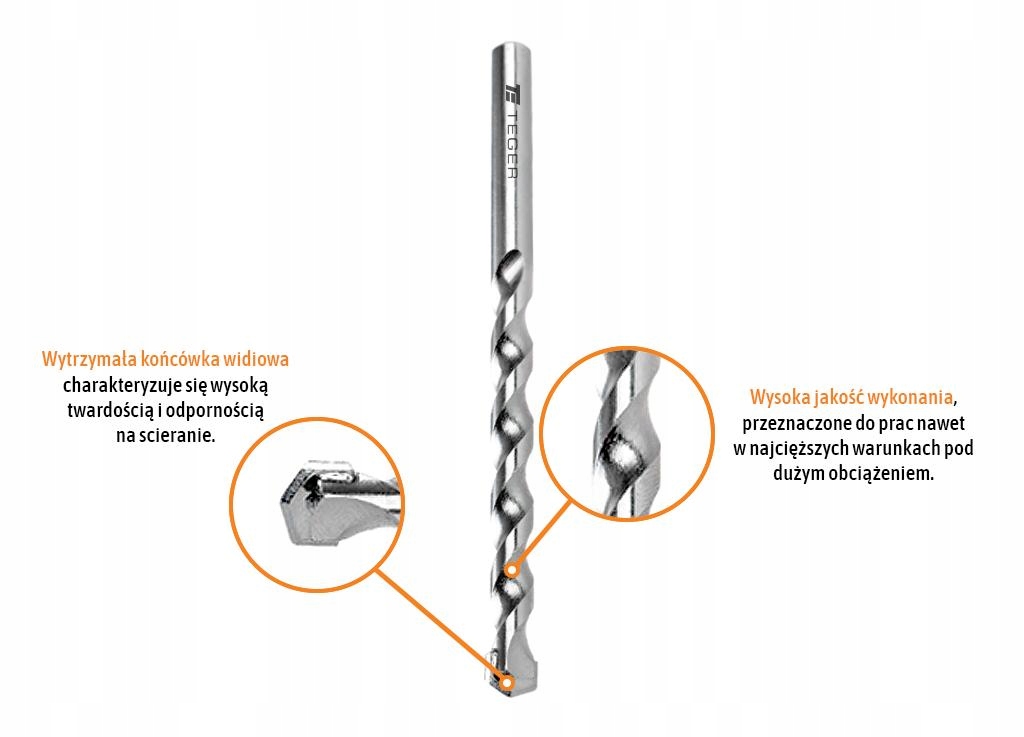 Wiertło do betonu widiowe - standard marki TEGER / wykonane wg normy DIN 8039 niezwykle trwałe, twarde i odporne na ścieranie. Wysoka jakość wykonania, przeznaczone do prac nawet w najcięższych warunkach pod dużym obciążeniem. Posiadają precyzyjnie wykonaną widjE, która zapewnia wysoką jakość i trwałość wiertła.