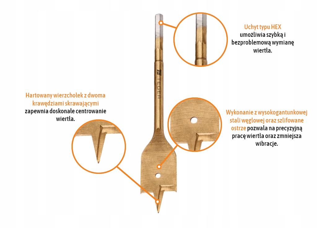 Wiertło do drewna płaskie - łopatkowe marki TEGER / przeznaczone do wiercenia dużych otworów w drewnie, płycie meblowej, tworzywach sztucznych, płycie gipsowej oraz gazobetonie. Hartowany wierzchołek z dwoma krawędziami skrawającymi zapewnia doskonałe centrowanie wiertła. Wykonanie z wysokogatunkowej stali węglowej oraz szlifowane ostrze pozwala na precyzyjną pracę wiertła oraz zmniejsza wibrację.