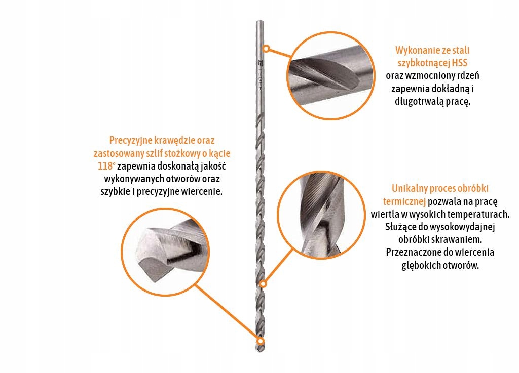 Wiertło do metalu HSS - długie (DIN 1869) marki TEGER to precyzyjne wiertło, wykonane ze stali szybkotnącej (HSS) zgodnie z normą DIN 1869. Służące do wysokowydajnej obróbki skrawaniem, przeznaczone do wiercenia głębokich otworów w stalach stopowych i węglowych o wytrzymałości na rozciąganie
