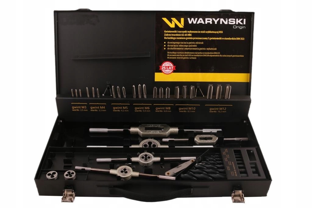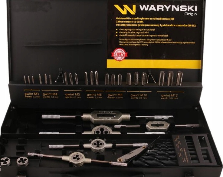 Zestaw narzynek i gwintowników ze stali HSS M3-M12 z uchwytami marki WARYŃSKI