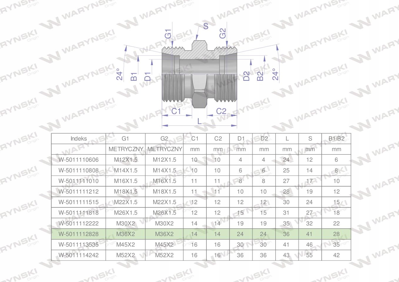 Złączka hydrauliczna metryczna BB M36x2 28L (XG) Waryński. Elementy złączne zostały zaprojektowane i wykonane zgodnie z obowiązującymi normami, które szczegółowo opisują wymagania jakościowe i wymiarowe. Są kompatybilne z elementami złącznymi innych renomowach producentów hydrauliki siłowej.