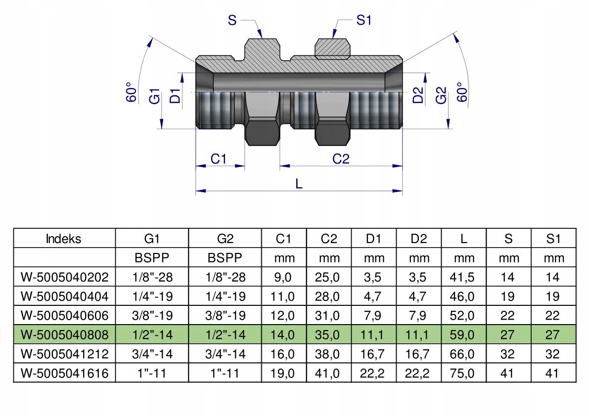 Złączka hydrauliczna grodziowa BB 1/2" BSP z przeciwnakrętką (XSV) WARYŃSKI